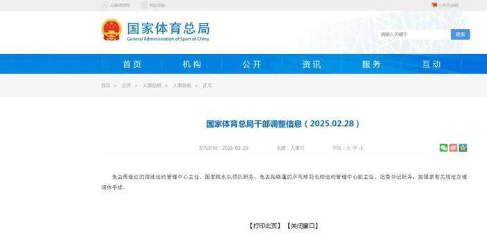 此前,3月26日,据国度体育总局网站音书:免去周继红的游水通顺责罚中心主任、国度跳水队领队职务。