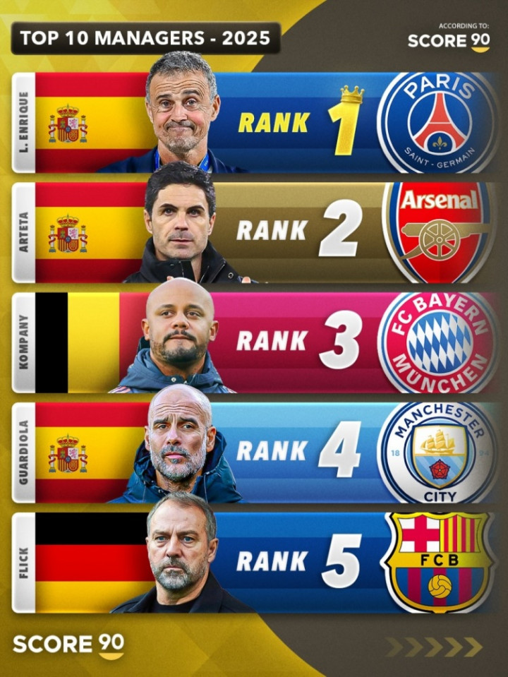 直播吧12月31日讯2025年寰宇足坛年终盘货,Score90评比出2025年年度最好主帅,其中恩里克实至名归名次榜首,阿森纳主帅阿尔特塔名循序2。