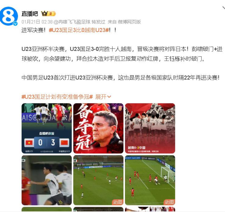 当大巨额国东说念主还在睡梦中时,中国足球偷偷干了一件大事,U23国足在亚洲杯半决赛3-0横扫越南,历史初次杀进决赛!更让东说念主神采热潮的是,这场告捷径直登上了《新闻联播》!要知说念,上一次国足在《新闻联播》露脸,一经2017年世初赛1-0胜韩国。7年畴昔,这支平均年事21岁的“小国足”体育赛事直播,终于让中国球迷扬眉吐气了一趟!他们是若何作念到? 这届U23亚洲杯,中国小将给中国东说念主长脸了,毕竟以前咱们是不敢思象,他们能胜澳大利亚,能逼平乌兹别克斯坦,更不思确信,他们能3球大捷越南队,与